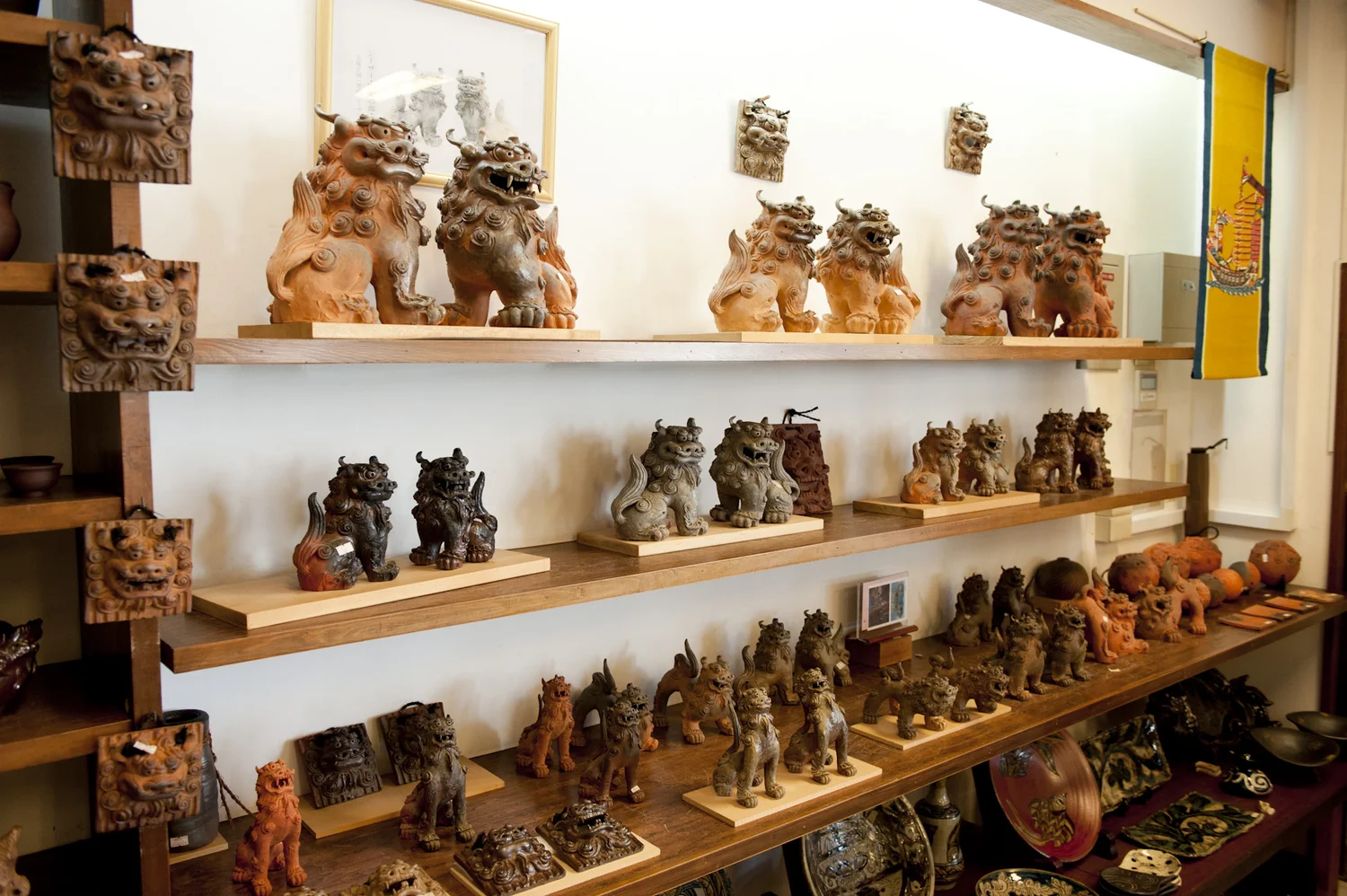 シーサーと陶器の店。玉城正明の直売店。その他多数の陶工の作品(灰かぶりシーサー、創作シーサー、伝統的シーサーなど)を取り扱っています。また陶器においては「日常の豊かさ」をテーマに、数々の作家の作品を取り揃えて販売しています。H29年よりさんごシーサーも仲間入りしました。